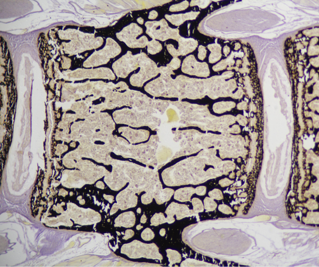 树脂包埋切片法是骨组织以及其他硬组织材料研究的最佳方法之一。无需脱钙,能够完整保留骨骼的成分,可用于骨形成及矿化沉积的分析,例如BFR,MAR等。我们采用甲基丙烯酸甲酯(MMA)树脂包埋法,可对骨组织及其他硬组织(种子,以及早中期牙齿等),进行切片(HistoCore Autocut, Leica)及分析(Osteomeasure 软件)。